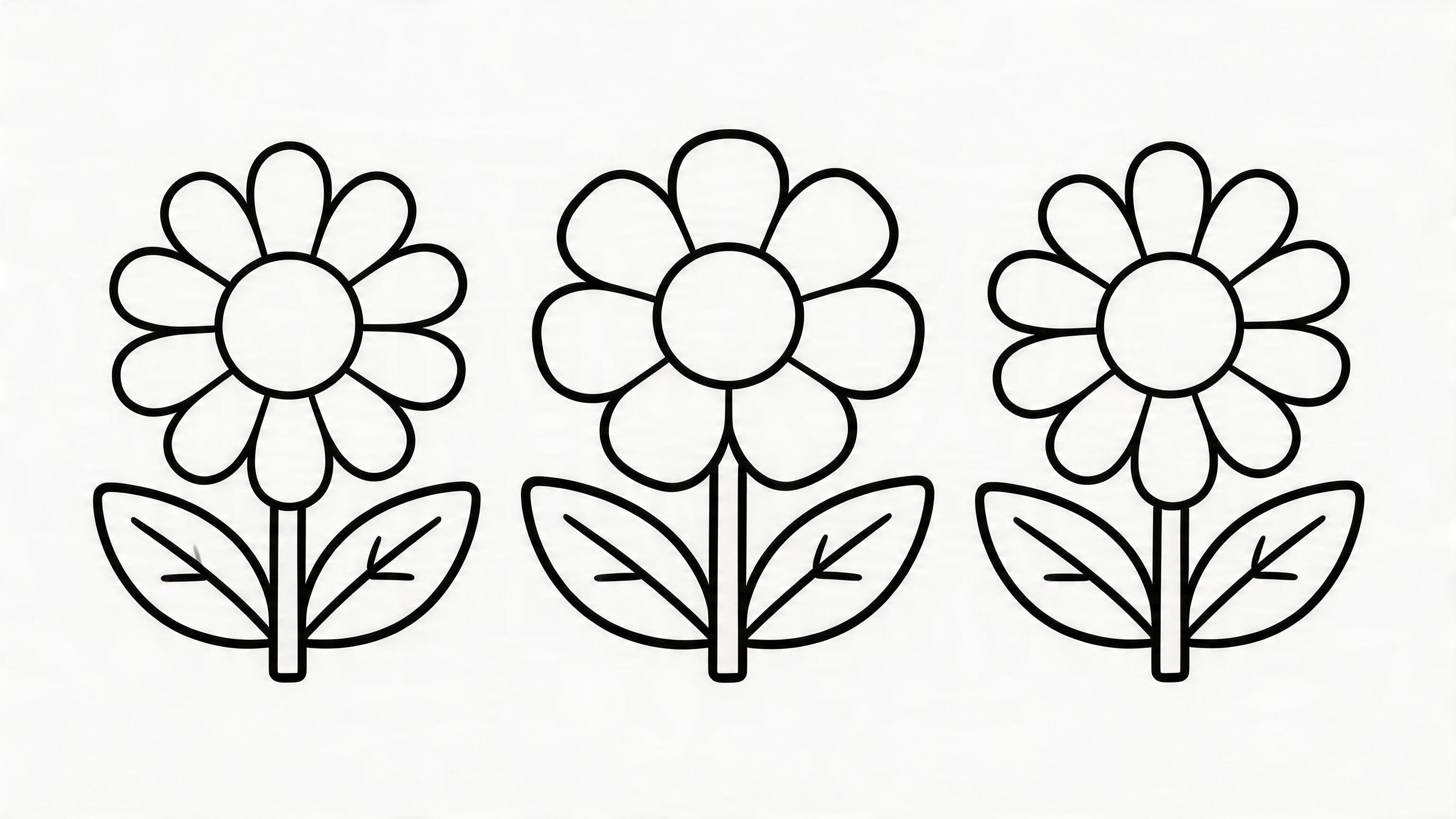 Cap the flower count at 3. "A garden of flowers" creates 20+ tiny petals nobody can color. "Three simple flowers" gives a clean, finishable page.