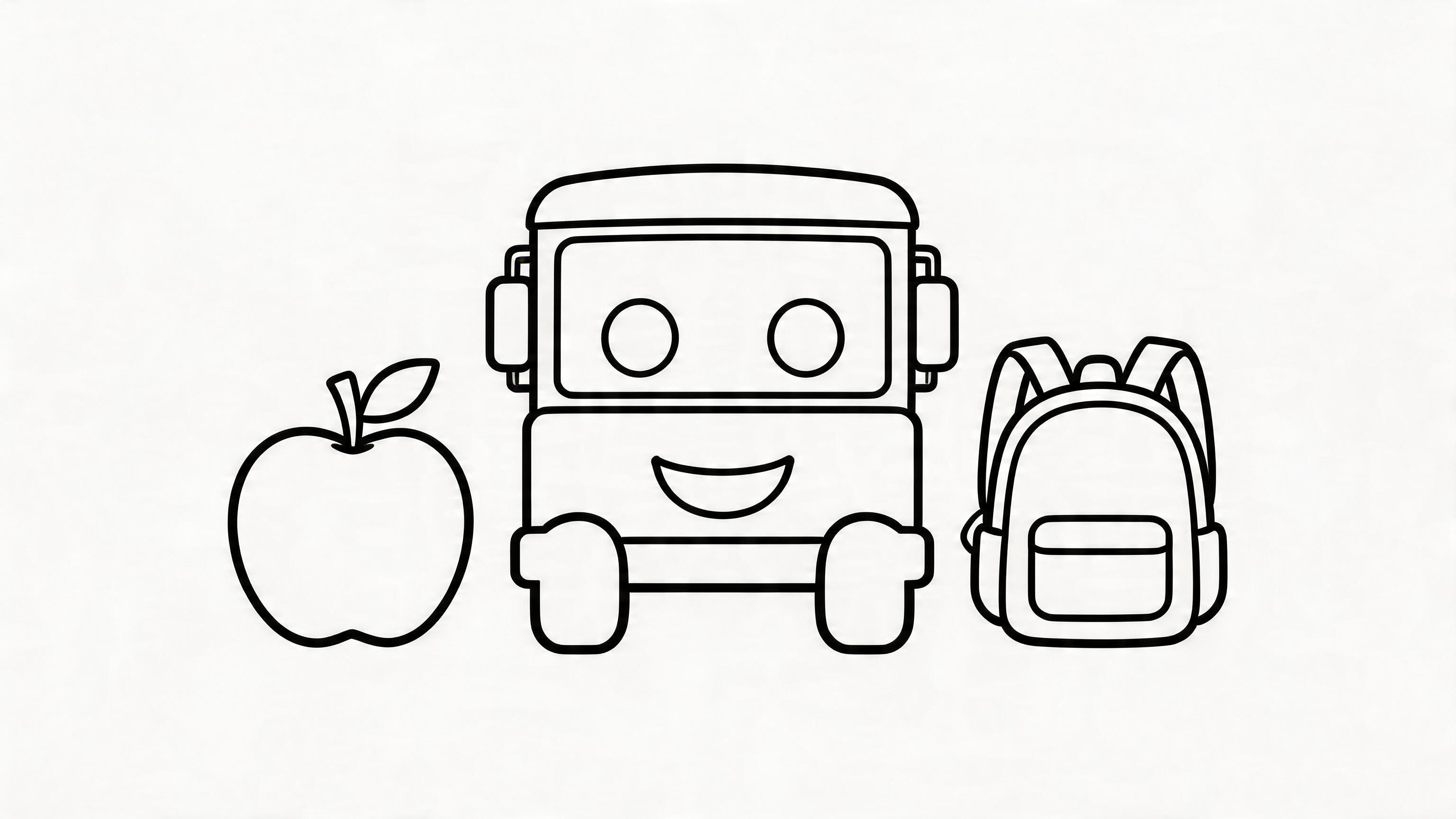 A smiling school bus with one apple and one backpack, bold clean outlines, simple printable coloring page