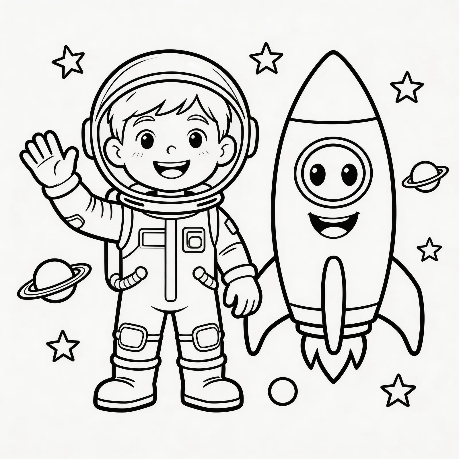 A cheerful astronaut next to a friendly rocket, bold clean outlines, simple printable coloring page